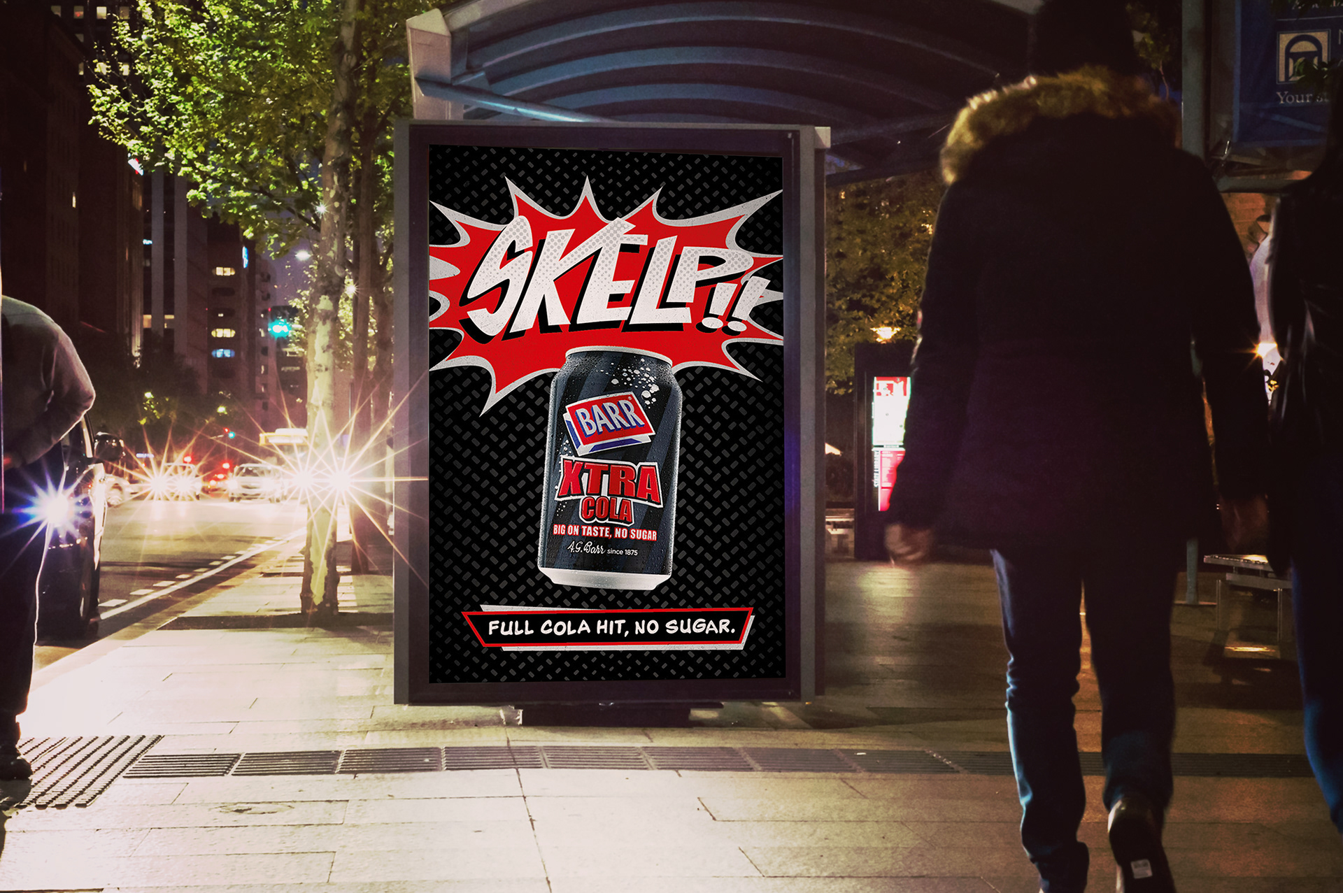 An outdoor campaign to promote the full cola flavour with no sugar in each can of Barr’s Xtra Cola.